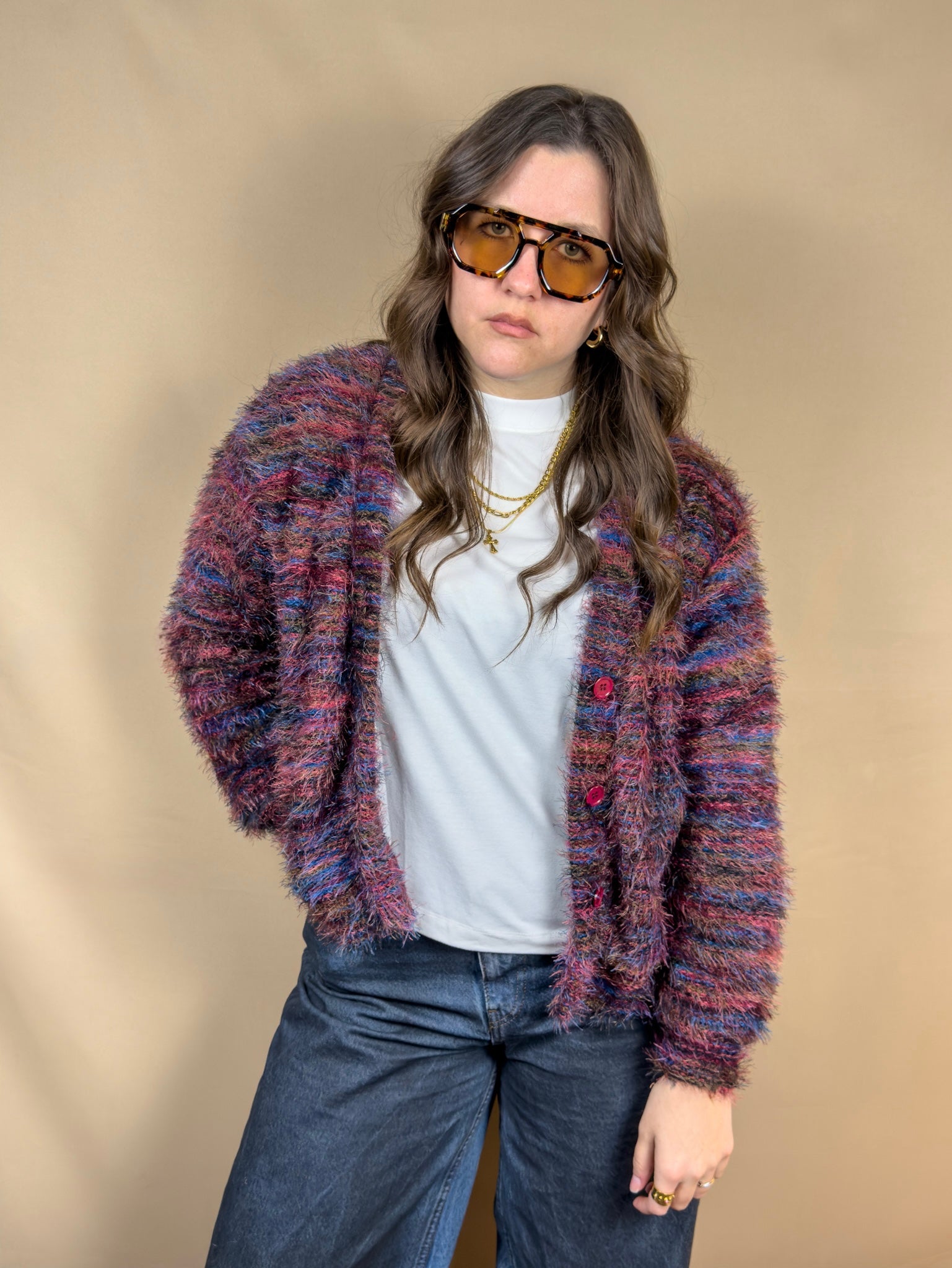Cardigan peloso oversize con mix colori bordeaux.